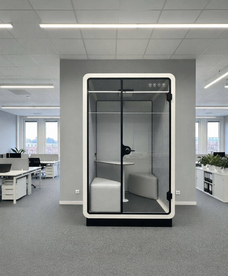 Akustyczna kabina to wyciszone biuro dla jednej lub dwóch osób, które zapewnia ciche środowisko do skoncentrowanej pracy, rozmów pełny opis i parametry