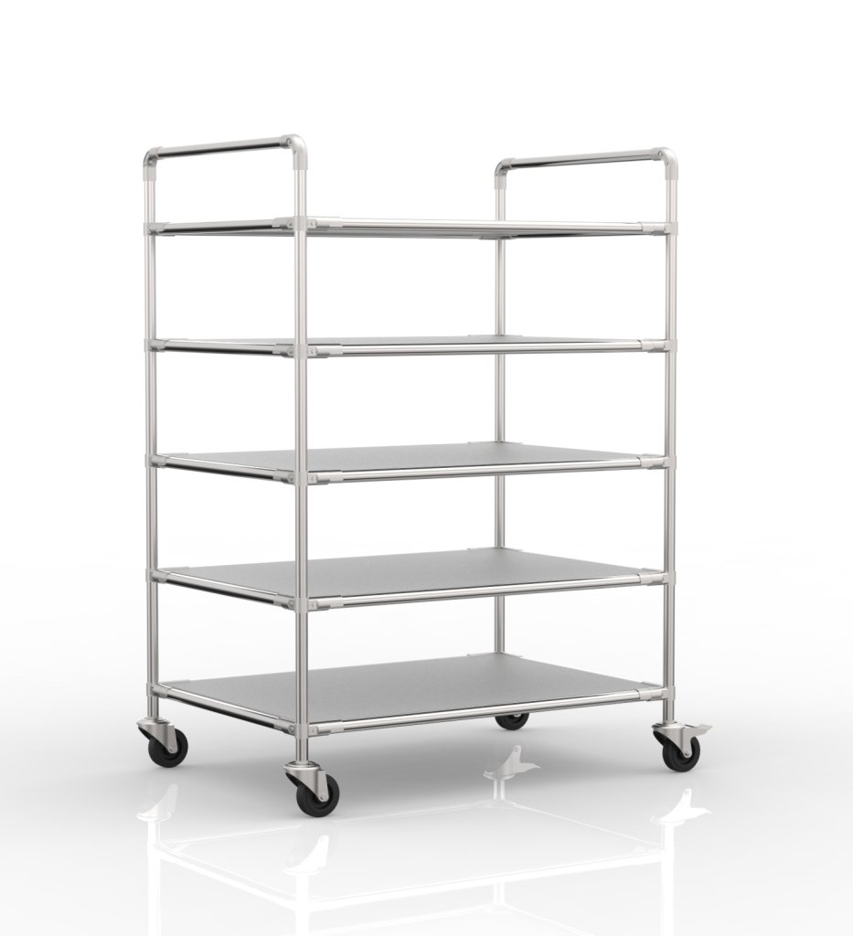 Wózek regałowy do skrzynek z pięcioma ukośnymi półkami to praktyczny pomocnik przy obsłudze w firmach produkcyjnych i centrach logistycznych, szczególnie w obszarze e-commerce. Wózek zawiera dwa kółka skrętne z hamulcem i dwa kółka skrętne bez hamulca o średnicy 100 mm. Zaletą tych kół są niskie opory toczenia i dzięki temu wygodne prowadzenie. Istnieje możliwość zmiany konfiguracji kół w zależności od wymagań klienta. Wózek wyposażony jest także w ergonomiczny uchwyt zapewniający łatwiejszą i wygodniejszą obsługę. Nośność całkowita 300 kg, nośność na półce 60 kg. Wymiary 1876 x 1366 x 861 mm.