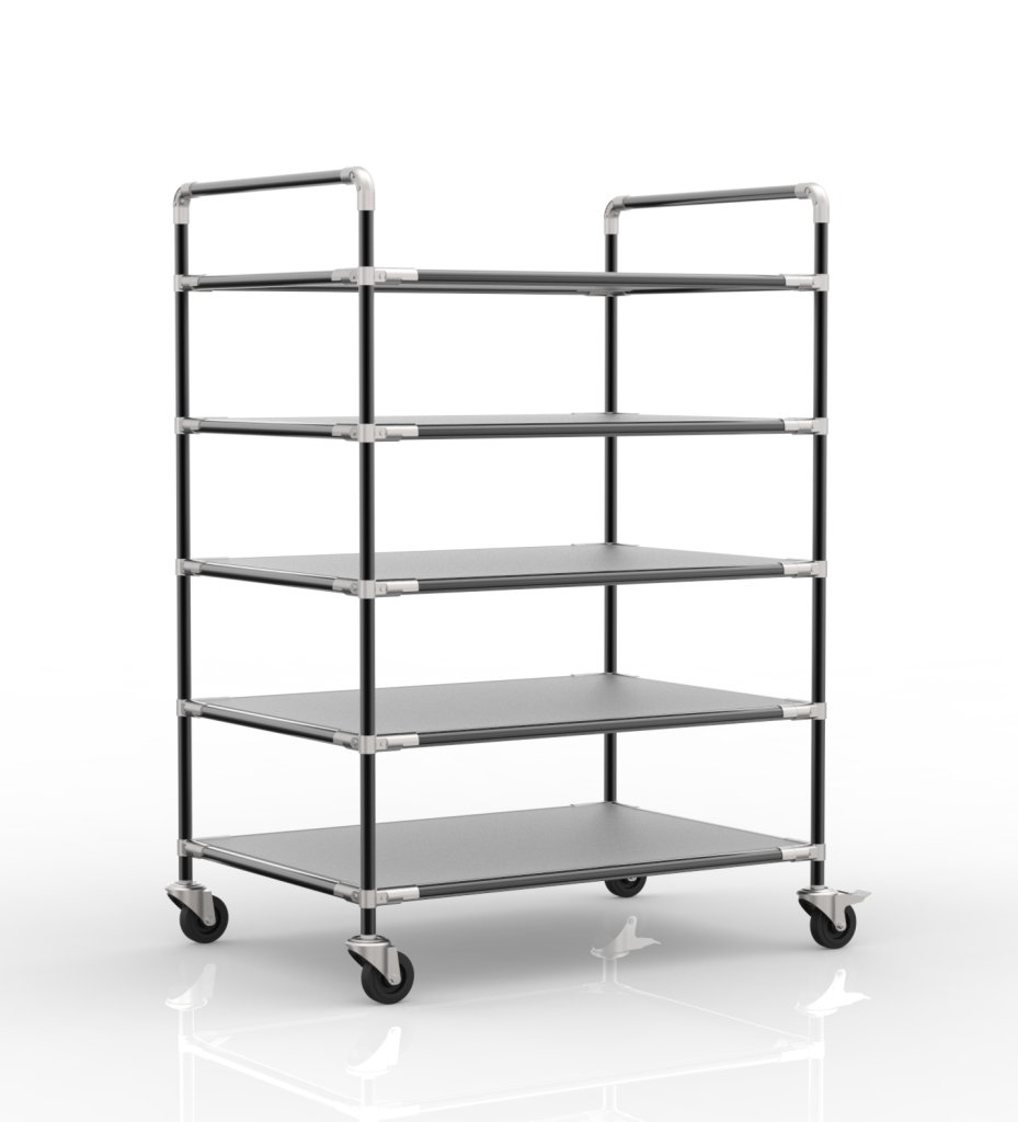 Wózek regałowy do skrzynek z pięcioma ukośnymi półkami to praktyczny pomocnik przy obsłudze w firmach produkcyjnych i centrach logistycznych, szczególnie w obszarze e-commerce. Wózek zawiera dwa kółka skrętne z hamulcem i dwa kółka skrętne bez hamulca o średnicy 100 mm. Zaletą tych kół są niskie opory toczenia i dzięki temu wygodne prowadzenie. Istnieje możliwość zmiany konfiguracji kół w zależności od wymagań klienta. Wózek wyposażony jest także w ergonomiczny uchwyt zapewniający łatwiejszą i wygodniejszą obsługę. Nośność całkowita 300 kg, nośność na półce 60 kg. Wymiary 1876 x 1366 x 861 mm.