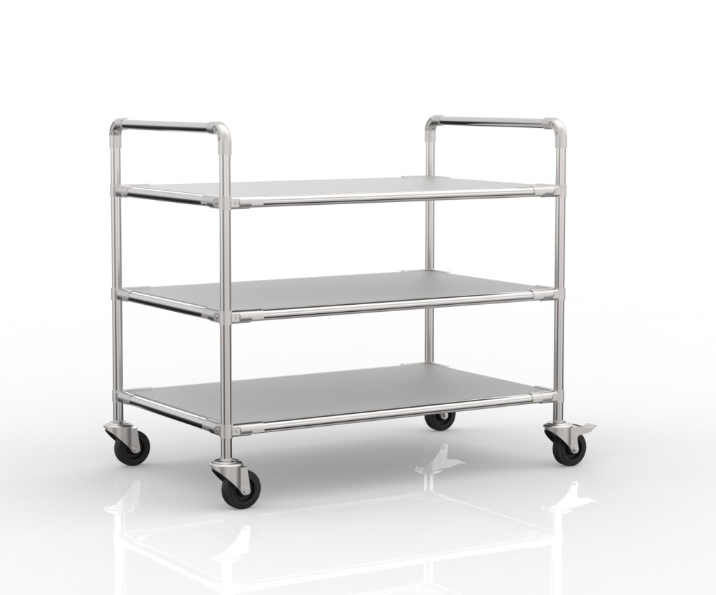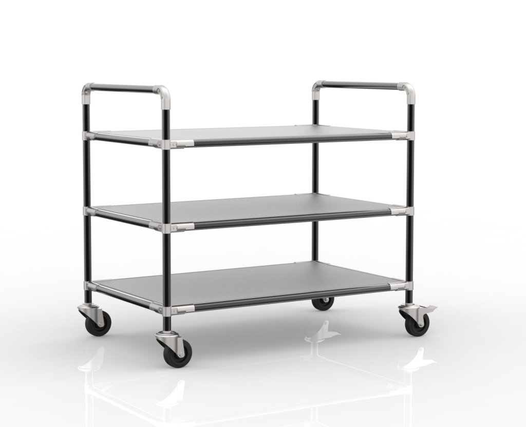 Antystatyczny wózek półkowy z rurowego systemu modułowego to idealny wybór do transportu towarów wrażliwych na wyładowania elektrostatyczne. W wózku znajduje się płyta laminowana ESD o grubości 18 mm. Wymiary 964 x 1068 x 768 mm, średnica koła 100 mm.