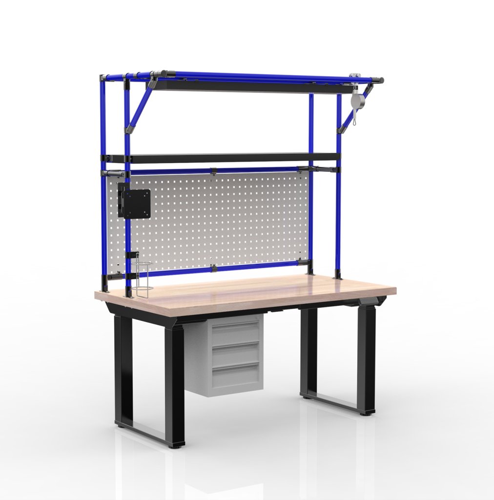 Elektronicznie regulowany na wysokość stół warsztatowy z blatem roboczym wykonanym z bukowego drewna klejonego. Stół wyposażony jest w perforowany panel do zawieszania pudełek lub narzędzi, kontener z trzema szufladami, ocynkowaną półkę, uchwyt na monitor, uchwyt na butelki PET o pojemności 2 litrów oraz oświetlenie LED. Wysokość powierzchni roboczej jest regulowana w zakresie 700 - 1350 mm. Nośność przy równomiernym obciążeniu wynosi 250 kg. Wymiary: 1800 - 2450 x 1400 x 750 mm.