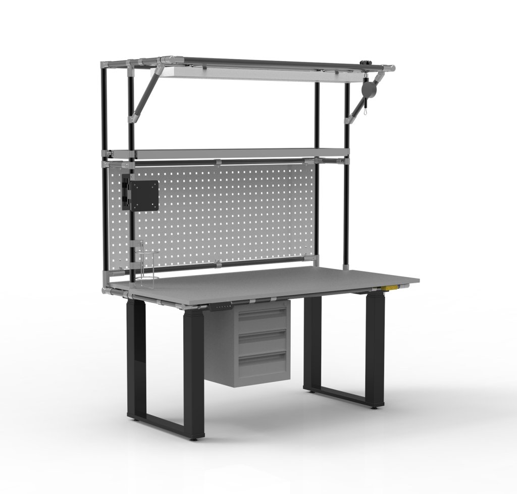 Ergonomiczny stół ESD do stanowisk chronionych elektrostatycznie z praktyczną nadstawką z systemu rurowego. W skład stołu wchodzi oświetlenie LED, panel perforowany oraz kontener z trzema szufladami. Stół jest wyposażony w intuicyjny sterownik z możliwością zapisania trzech zaprogramowanych wysokości, co ułatwia ergonomiczne ustawienie powierzchni roboczej w zakresie 680 – 1330 mm.