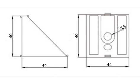 Kąt o kącie 45° do łączenia profili. Wymiary 40 x 44 x 44 mm.