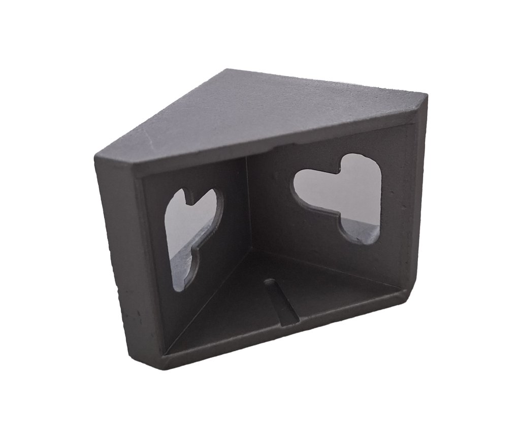 Kąt o kącie 90° do łączenia profili. Orteza boczna zapewnia dużą wytrzymałość stawów. Wymiary 60 x 28 x 60 mm. Materiały mocujące nie wchodzą w skład zestawu.