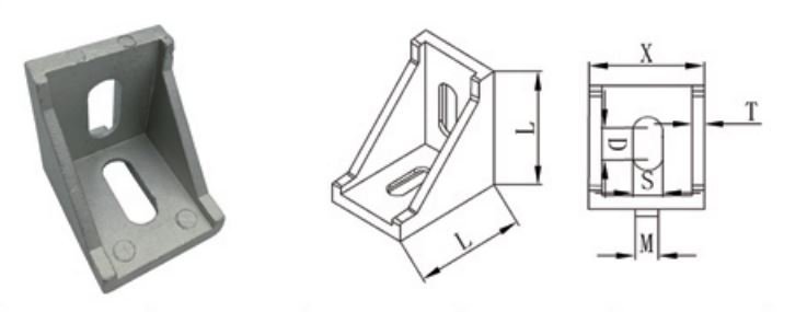 Kąt o kącie 90° do łączenia profili. Orteza boczna zapewnia dużą wytrzymałość stawów. Wymiary 60 x 28 x 60 mm. Materiały mocujące nie wchodzą w skład zestawu.