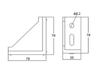 Kątownik o kącie 90° do łączenia profili. Boczne wzmocnienie zapewnia wysoką wytrzymałość połączenia. Grubość ścianki: 6,5 mm, grubość wzmocnienia: 3,5 mm. Wymiary: 78 x 36 x 78 mm.