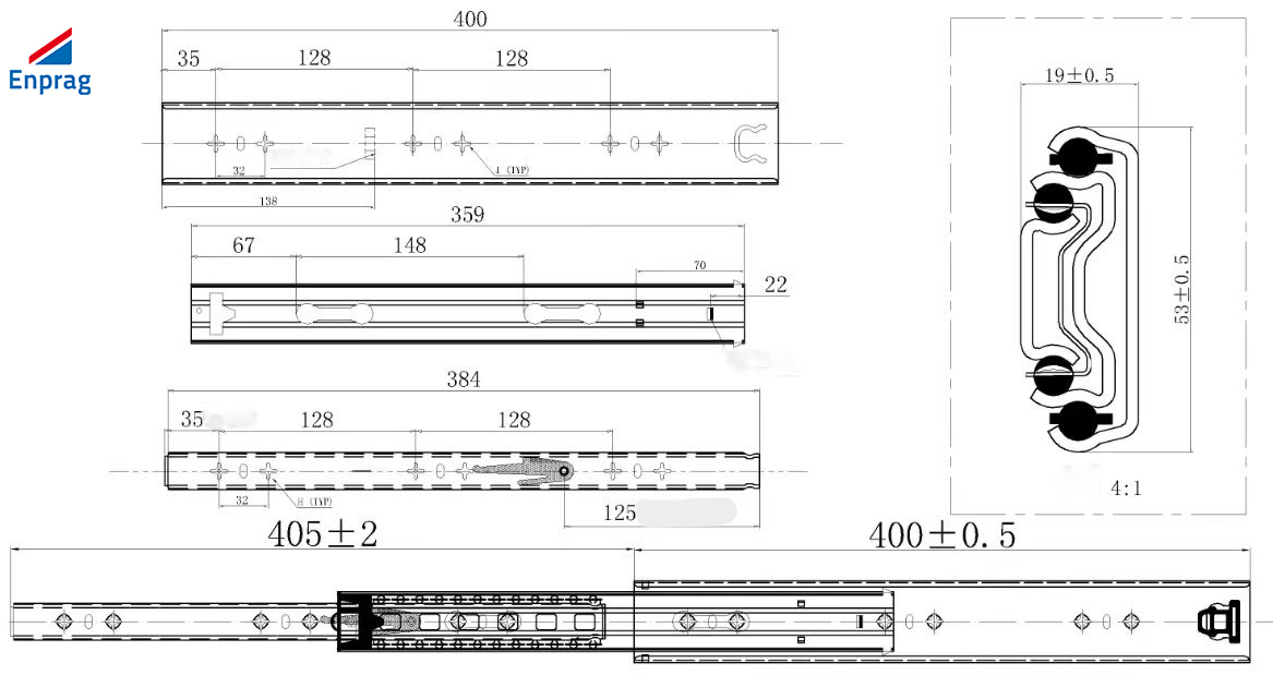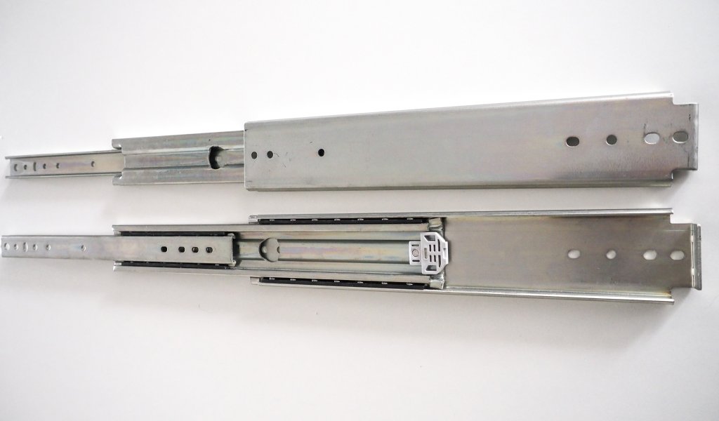 Prowadnice kulkowe w pełni wysuwane, komplet 2 sztuk, długość 400 mm, bez amortyzacji. Grubość materiału 2 mm. Nośność 90 kg.
