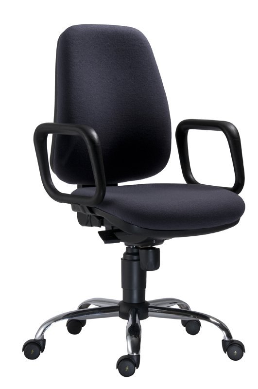 Krzesło biurowe z podłokietnikami z poliuretanu, zaprojektowane w celu odprowadzania ładunków elektrostatycznych z miejsca pracy, w którym znajdują się elementy elektroniczne i lotne chemikalia. Wszystkie części krzesła, łącznie ze specjalną tkaniną i kółkami, są przewodzące, rezystancja właściwa poniżej 0,1 MΩ, odcień poszycia - ciemnoszary (antracyt), chromowany krzyż, nośność 130 kg. Cena bez podłokietników.