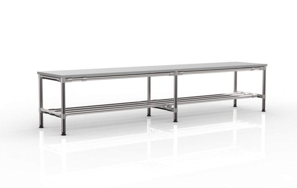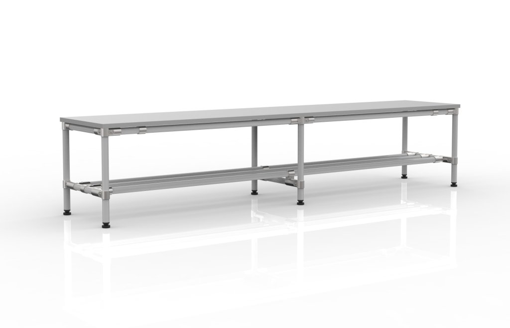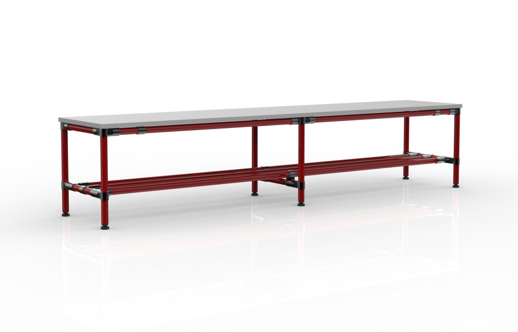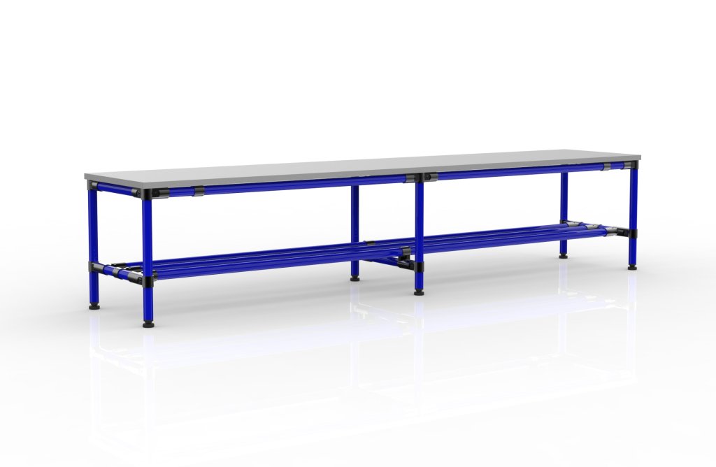 Ławka z systemu modułowego, wszystkie wymiary można dostosować do potrzeb klienta. Rury dostępne są w kilku kolorach oraz w wersjach ESD lub ze stali nierdzewnej.
