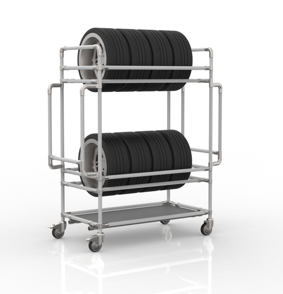 Mobilny regał na opony wykonany z systemu modułowego z rurkami z jedną półką i dwoma piętrami. Idealny do opon o rozmiarach 16" do 20". Regał zawiera dwa piętra do przechowywania opon, jedną półkę z płytą Akyboard o grubości 10 mm, uchwyt po każdej stronie dla wygodniejszej obsługi, dwa kółka z hamulcem oraz dwa kółka bez hamulca o średnicy 100 mm. Opony nie są w zestawie. Nośność półki wynosi 100 kg, całkowita nośność wynosi 200 kg. Wymiary: 1500 x 1068 x 600 mm.