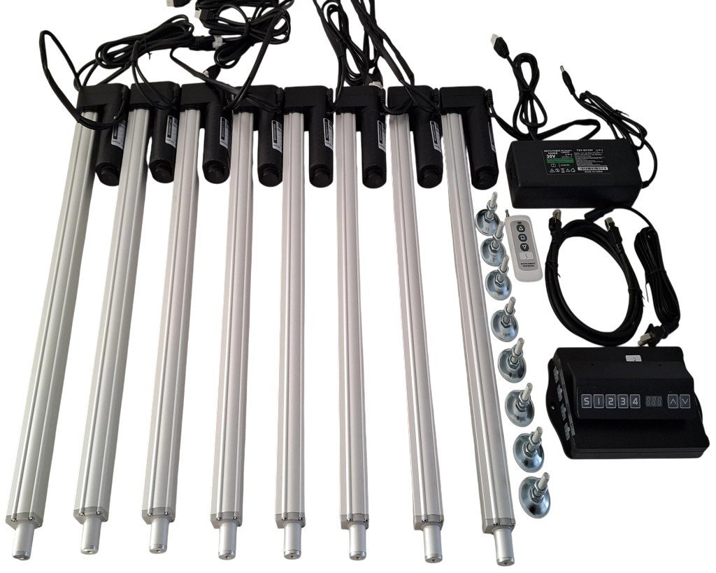 Elektryczny napęd liniowy zasilany napięciem 24V. Nośność napędu wynosi 3000 N. Maksymalny wysuw urządzenia to 45 cm. LEG_SET 8 zawiera 8 nóg, sterowanie, pilota zdalnego sterowania, zasilanie, śruby regulacyjne, kable zasilające.