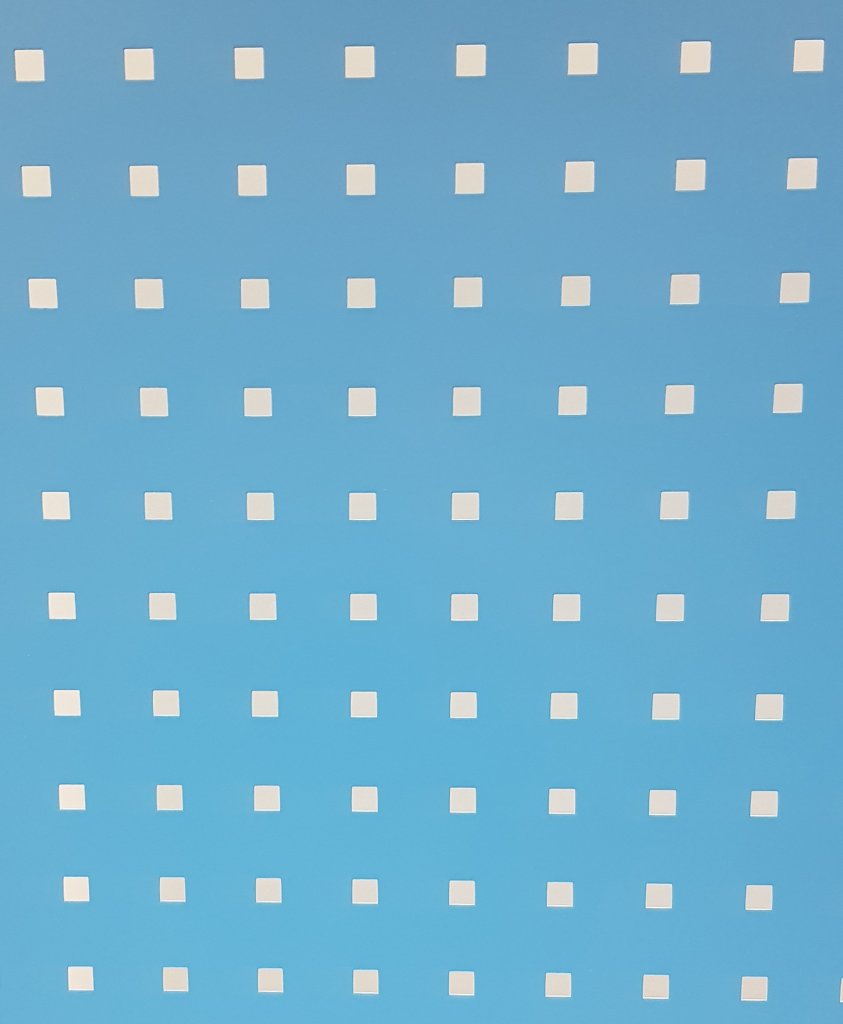Panel perforowany, idealny do zawieszania narzędzi i szybkiego dostępu do elementów złącznych. Wymiary 2000 x 1000 mm, grubość 1,4 mm, kwadratowe otwory 10 x 10 mm, rozstaw otworów 38 x 38 mm, kolor niebieski RAL 5012 półmat.
