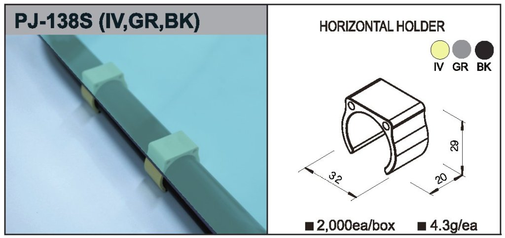 Uchwyt plastikowy typu PJ-138S, odpowiednia np. jako podpórka pod półkę. Kolor beżowy (IV) lub czarny (BK), waga 4,3 g.