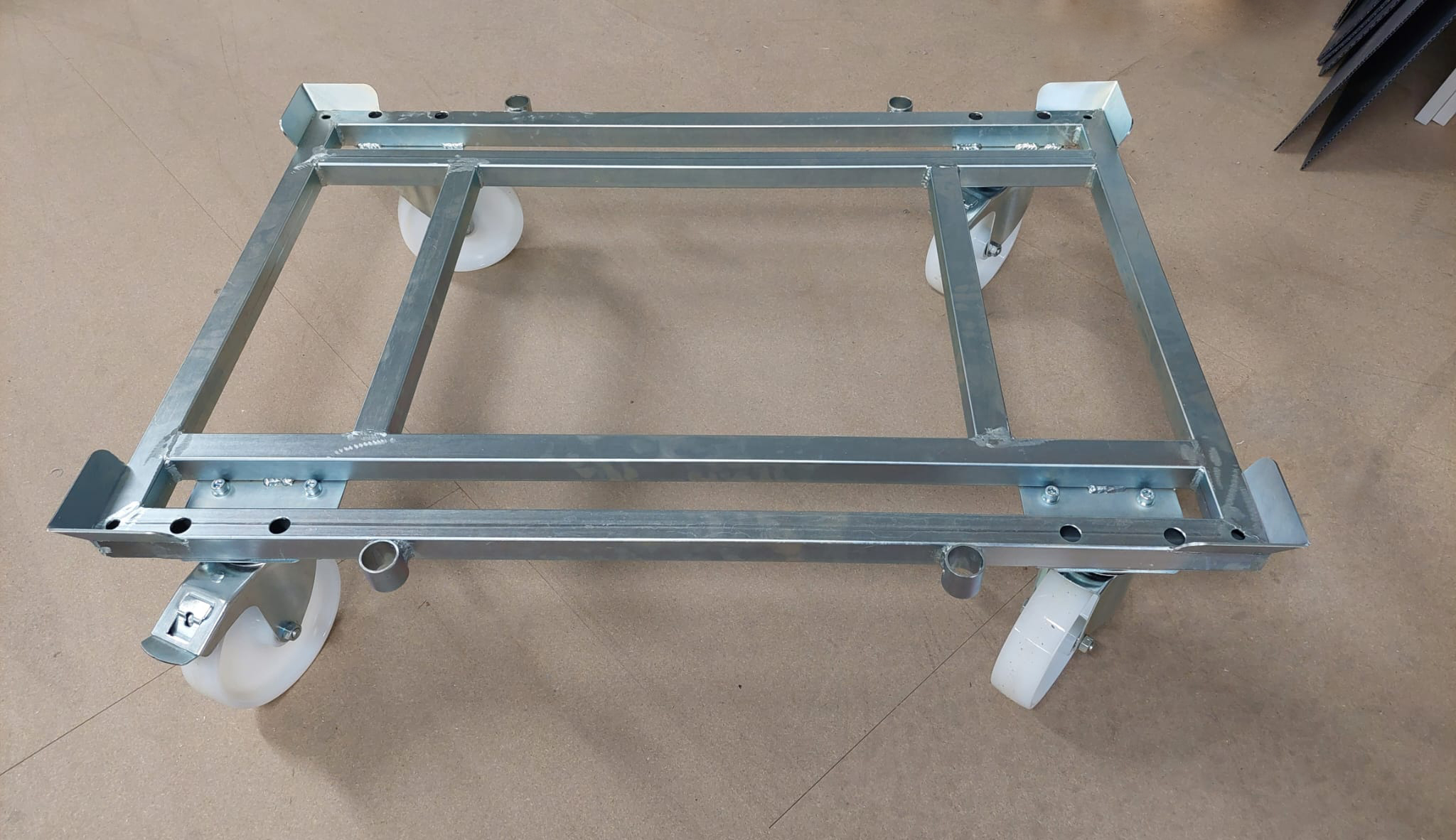 Podwozie manipulacyjne wykonane ze zmontowanych elementów stalowych o wymiarach 40x40 mm. Dzięki nośności do 750 kg idealnie nadaje się do transportu cięższych przedmiotów. 2 koła skrętne z hamulcem i 2 skrętne bez hamulca o średnicy 125 mm. Podwozie dostępne jest w kilku wariantach – powierzchnia ocynkowana lub kolorowy lakier. Wymiary 350 x 840 x 1350 mm.