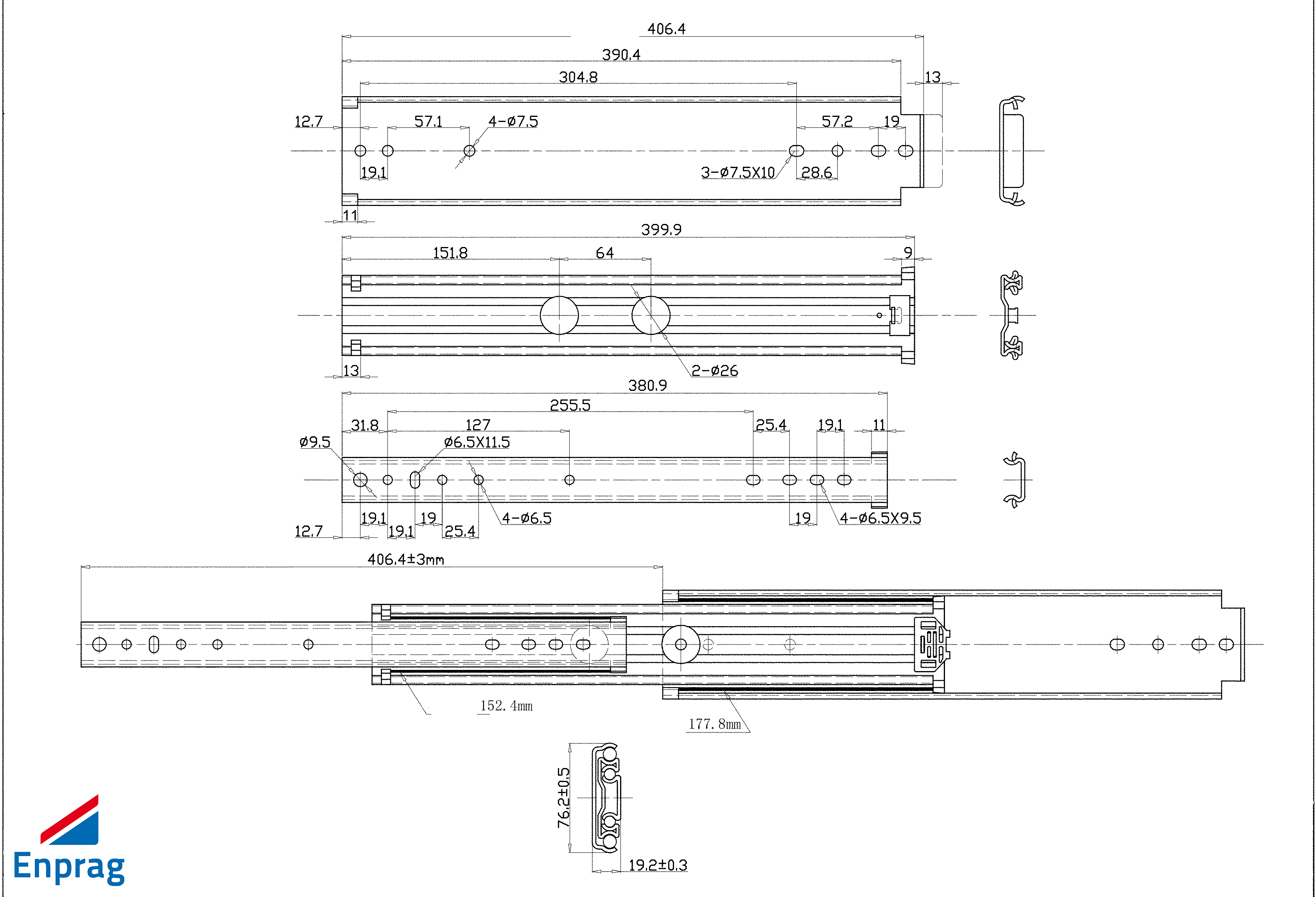 Prowadnica kulkowa pełnego wysuwu 406 mm, bez domykania. Grubość materiału 2,5 mm. Nośność 150 kg.