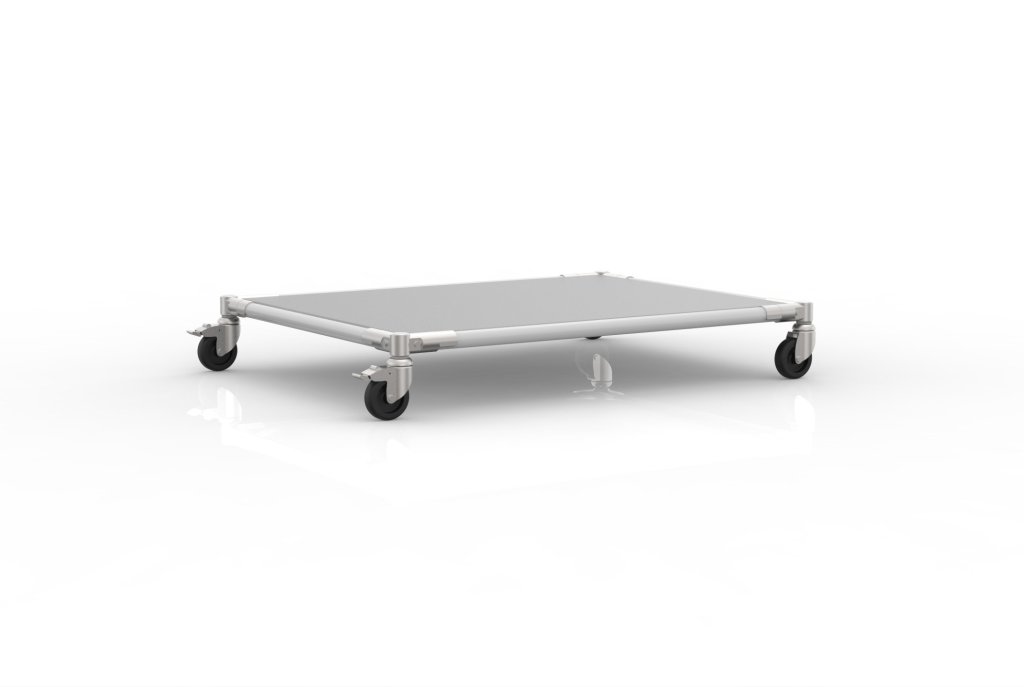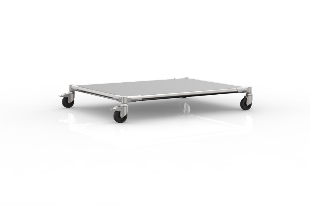 Podwozie przeładunkowe wykonane z systemu rurowego nadaje się do różnych celów przeładunkowych w magazynach i warsztatach. W skład podwozia wchodzi płyta laminowana, 2 kółka skrętne z hamulcem i 2 kółka skrętne bez hamulca o średnicy 75 mm, które umożliwiają łatwe przemieszczanie przedmiotów. Wymiar wewnętrzny jest przeznaczony dla 2 skrzynek o wymiarach 600 x 400 mm. Wymiary 878 x 678 x 138 mm.
