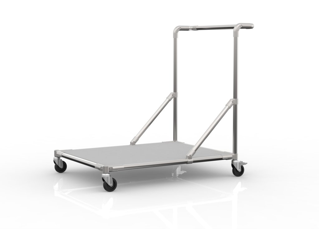 Podwozie manipulacyjne z uchwytem wykonanym z systemu rurowego nadaje się do różnych celów manipulacyjnych w magazynach i warsztatach. W skład podwozia wchodzi płyta laminowana, 2 kółka skrętne z hamulcem i 2 kółka skrętne bez hamulca o średnicy 75 mm, które umożliwiają łatwe przemieszczanie przedmiotów. Wymiar wewnętrzny jest przeznaczony dla 2 skrzynek o wymiarach 600 x 400 mm. Wymiary 878 x 678 x 900 mm.
