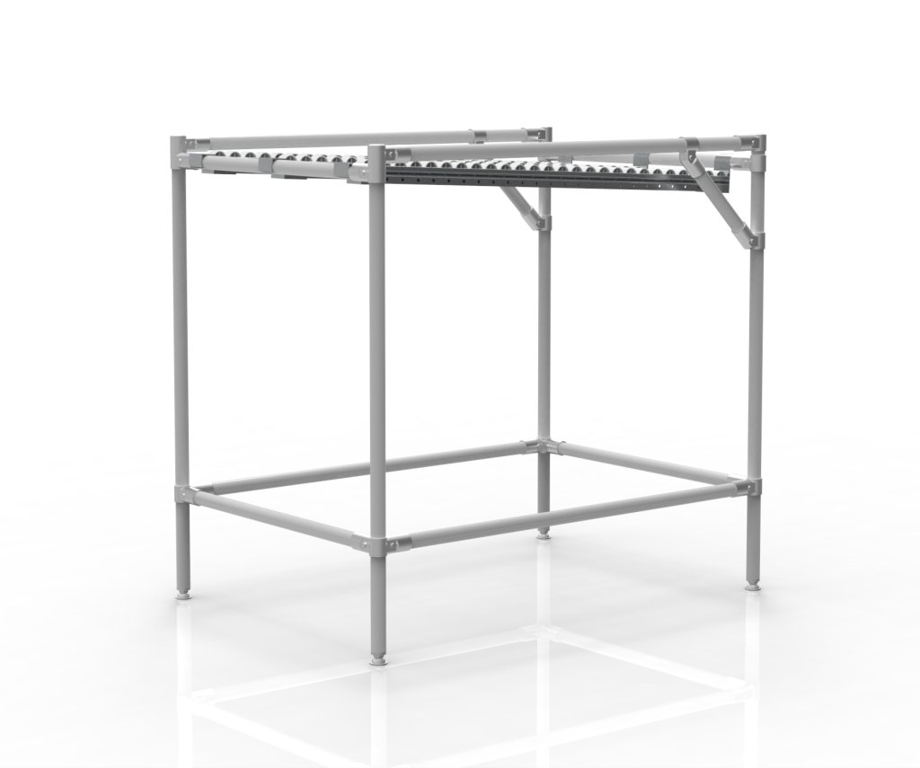 Przenośnik grawitacyjny z rurowego systemu modułowego jest przeznaczony do efektywnego składowania i transportu pojemników oraz skrzynek KLT. Składa się z torów rolkowych, które umożliwiają łatwy i płynny ruch pojemników na całej długości przenośnika w kierunku spadku.