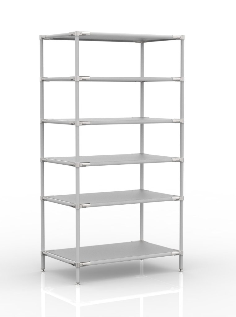 Regał wykonany z rurowego systemu modułowego z sześcioma prostymi półkami jest praktycznym pomocnikiem. Zapewnia przejrzyste przechowywanie towarów, dokumentów czy narzędzi. Częścią półki jest płyta laminowana o grubości 18 mm. Całkowite obciążenie 300 kg, nośność na półkę 50 kg. Wymiary 1850 x 963 x 603 mm.