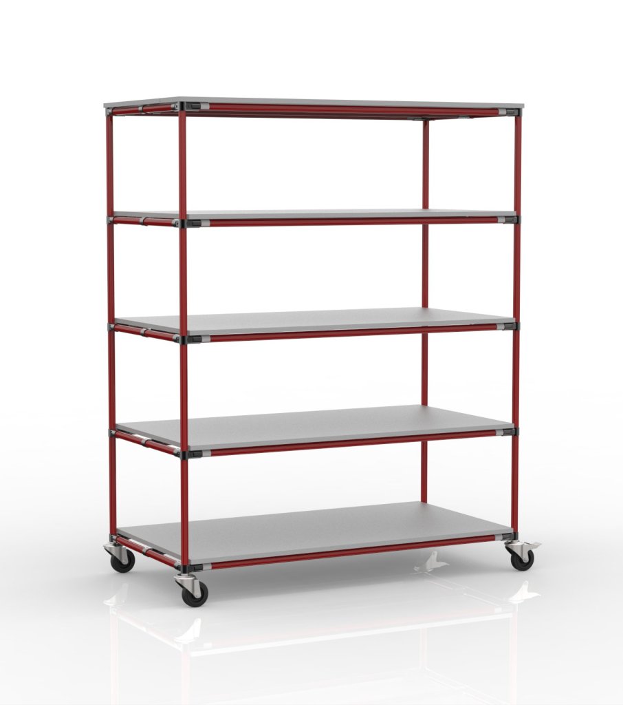 Regał półkowy z pięcioma prostymi półkami jest praktycznym pomocnikiem przy obsłudze w firmach produkcyjnych i centrach logistycznych, szczególnie w obszarze e-commerce. Wózek posiada cztery skrętne koła o średnicy 100 mm. Zaletą tych kół są niskie opory toczenia i dzięki temu wygodne prowadzenie. Istnieje możliwość zmiany konfiguracji kół w zależności od wymagań klienta. Nośność całkowita 300 kg, nośność na półce 75 kg. Wymiary 1900 x 1505 x 755 mm.
