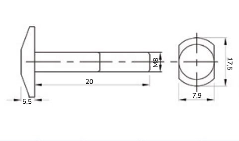 Śruba z łbem T do mocowania akcesoriów do profili aluminiowych. Długość śruby 20 mm.