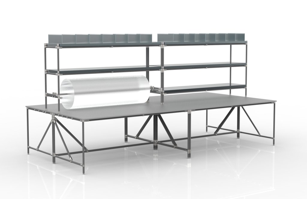 Uniwersalny stół warsztatowy do pakowania przesyłek. Kolor konstrukcji można dobrać odpowiednio do rur. Przy równym obciążeniu nośność wynosi 100 kg. Wymiary 2002 x 1803 x 803 mm. Stół nadaje się do sklepów internetowych, centrów logistycznych i magazynów.