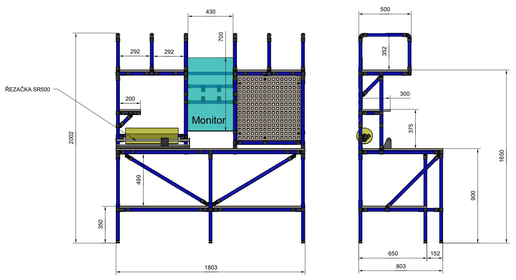 Stół z regulacją wysokości z rurowego systemu modułowego. W skład stołu wchodzi płyta laminowana o grubości 18 mm, pojemnik warsztatowy, panel perforowany do zawieszania skrzynek lub narzędzi oraz oświetlenie. Wysokość powierzchni roboczej można regulować w zakresie 650 – 950 mm. Nośność przy równomiernym obciążeniu 150 kg. Wymiary stołu 2100 x 1500 x 700 mm.