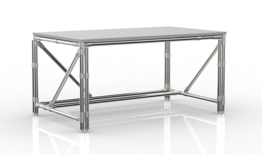 Stół warsztatowy wykonany z systemu modułowego rurowego z blatem z laminatu o grubości 18 mm, kontenerkiem stołowym podwieszanym z dwiema szufladami i czterema regulowanymi nogami. Nośność przy równomiernym obciążeniu 100 kg. Wymiary 850 x 1200 x 750 mm.