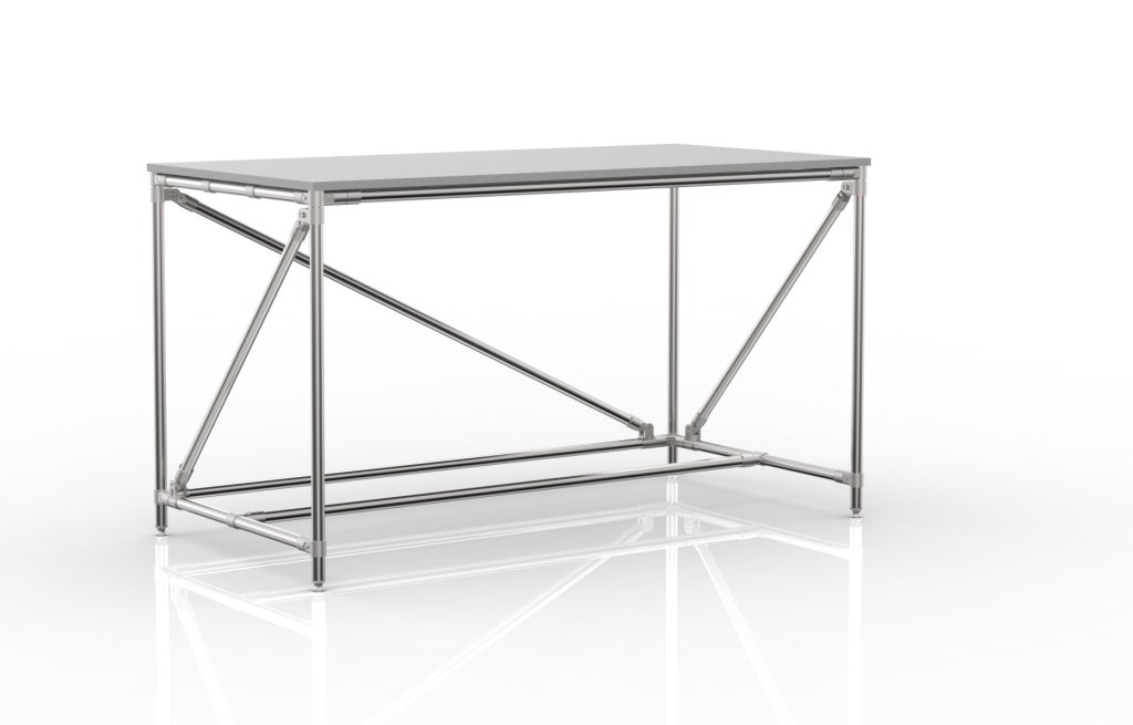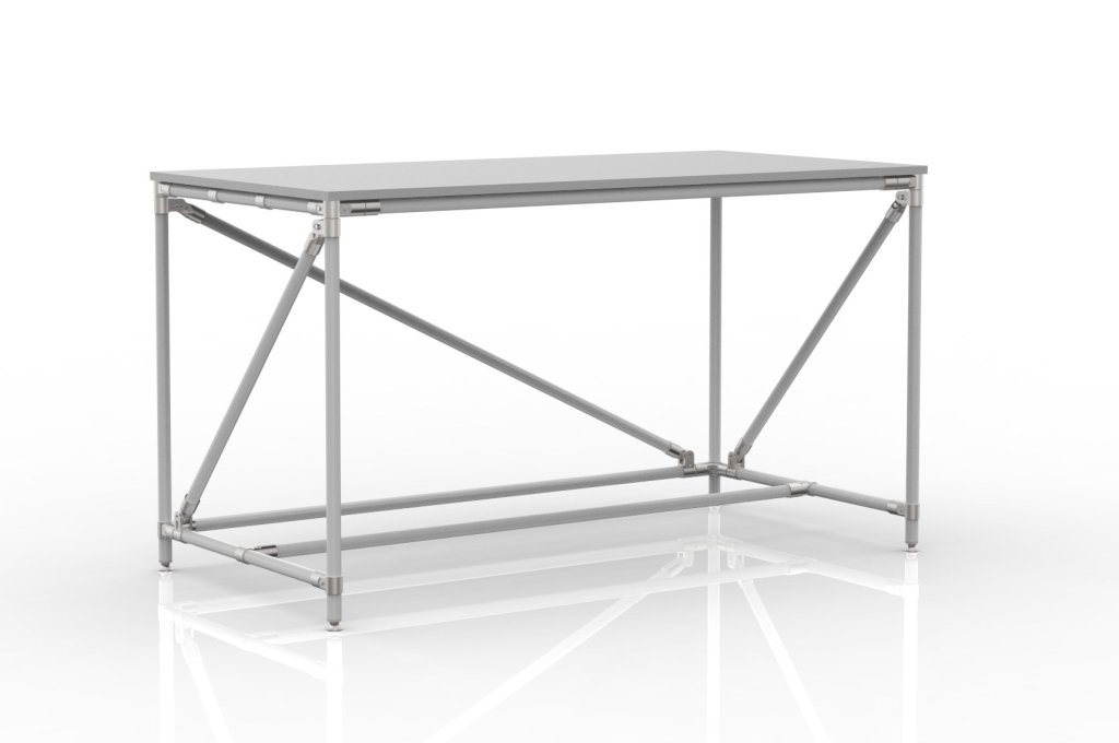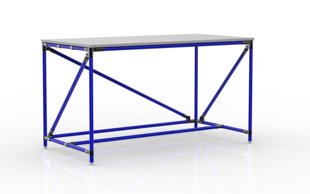 Stół warsztatowy z rurowego systemu modułowego. Stół posiada dwustronnie laminowany blat oraz cztery regulowane nogi. Nośność przy równomiernym obciążeniu 100 kg. Wymiary 850 x 1500 x 750 mm.