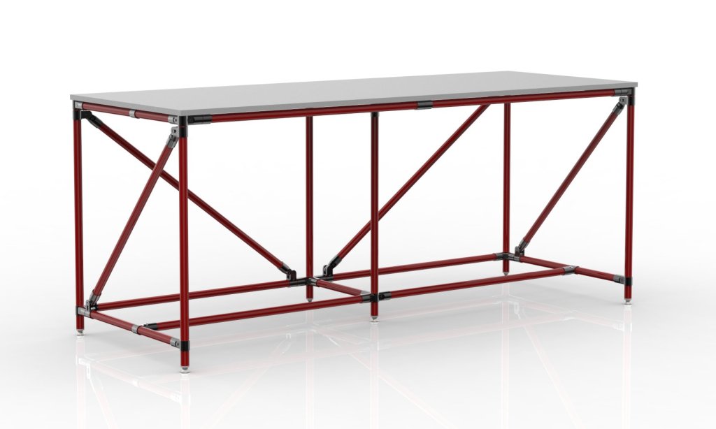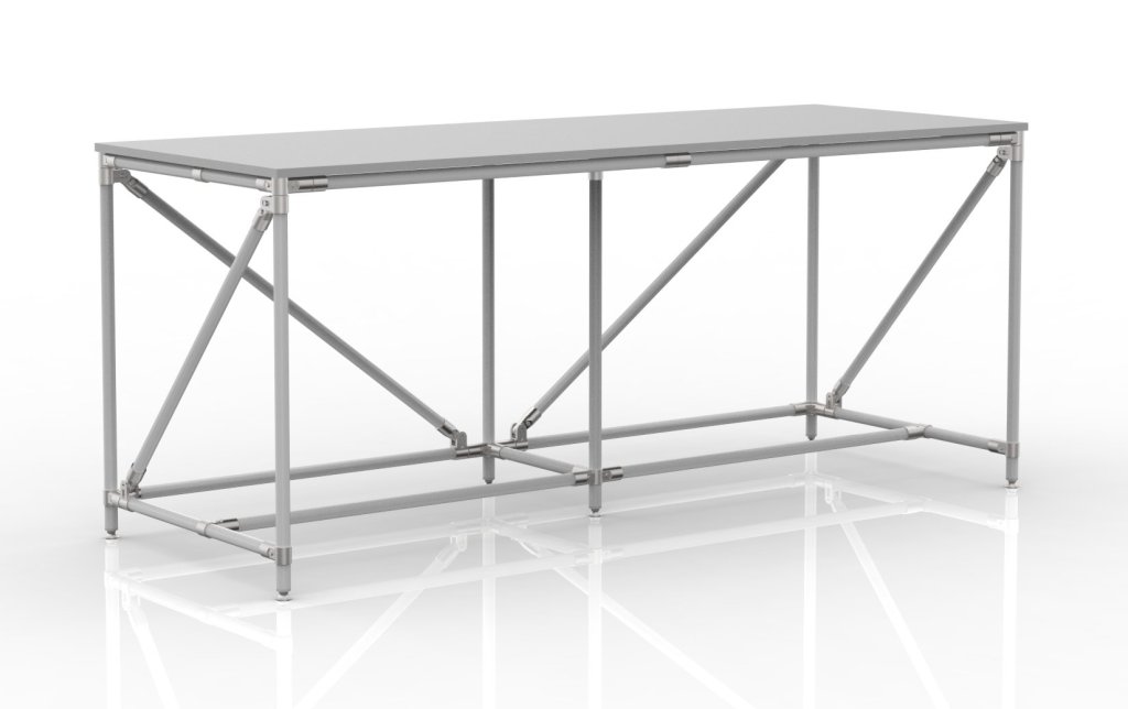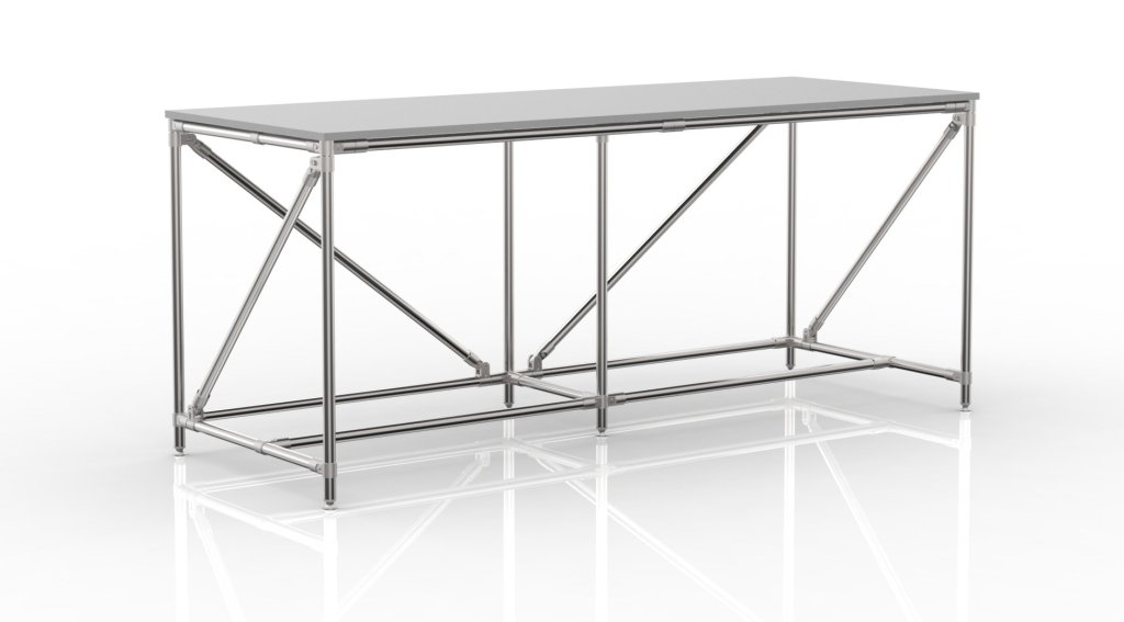Stół warsztatowy z systemu modułowego rurowego z blatem z laminatu o grubości 18 mm i czterema regulowanymi nogami. Nośność przy równomiernym obciążeniu 100 kg. Wymiary 850 x 2000 x 750 mm.