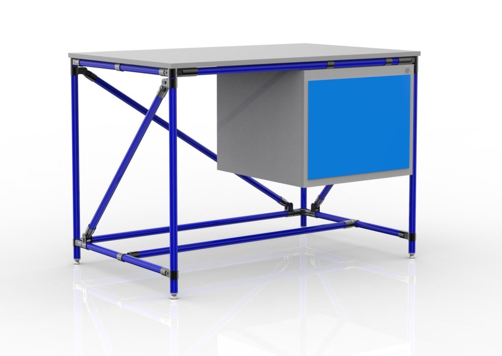 Stół warsztatowy wykonany z rurowego systemu modułowego z blatem z laminatu o grubości 18 mm, kontenerkiem stołowym i czterema pełny opis i parametry