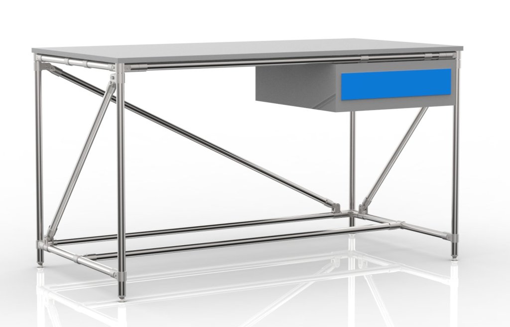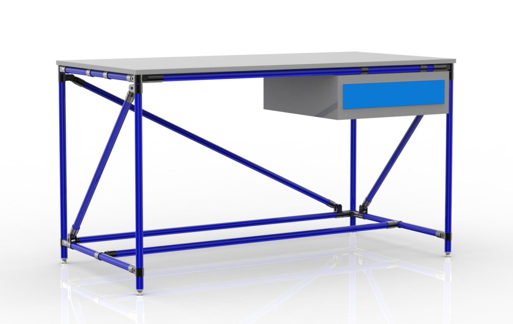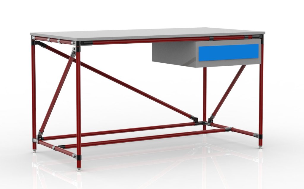 Stół warsztatowy z rurowego systemu modułowego. Stół składa się z dwustronnie laminowanego blatu, kontenerka stołowego z szufladą pełny opis i parametry
