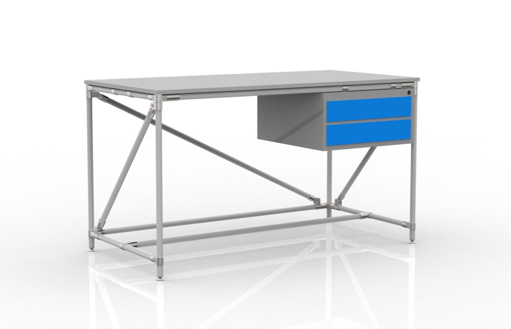 Stół warsztatowy wykonany z systemu modułowego rurowego z blatem z laminatu o grubości 18 mm, pojemnikiem stołowym z dwiema szufladami i czterema regulowanymi nogami. Nośność przy równomiernym obciążeniu 100 kg. Wymiary 850 x 1500 x 750 mm.