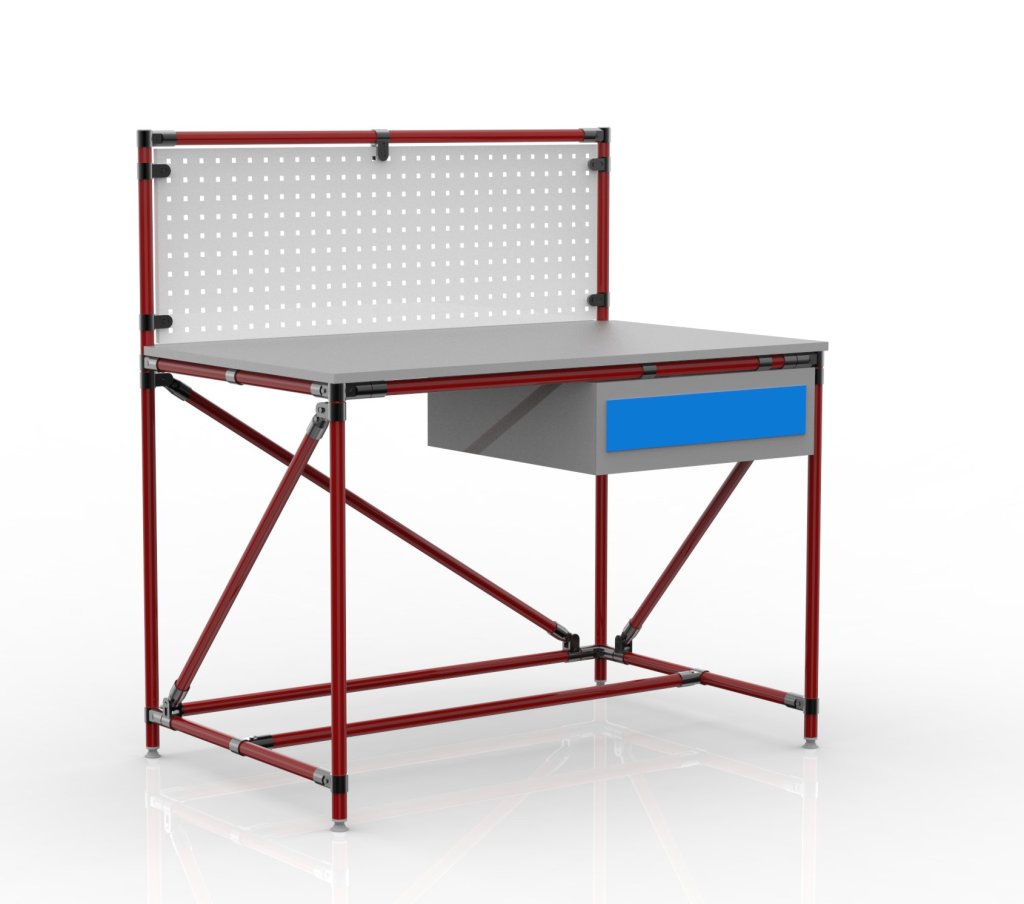 Stół warsztatowy z tablicą perforowaną z systemu modułowego rurowego. W skład stołu wchodzi blat laminowany, kontenerek podwieszany stołowy z jedną szufladą, tablica perforowana oraz cztery regulowane nogi. Nośność przy równomiernym obciążeniu 100 kg. Wymiary 1282 x 1200 x 750 mm.