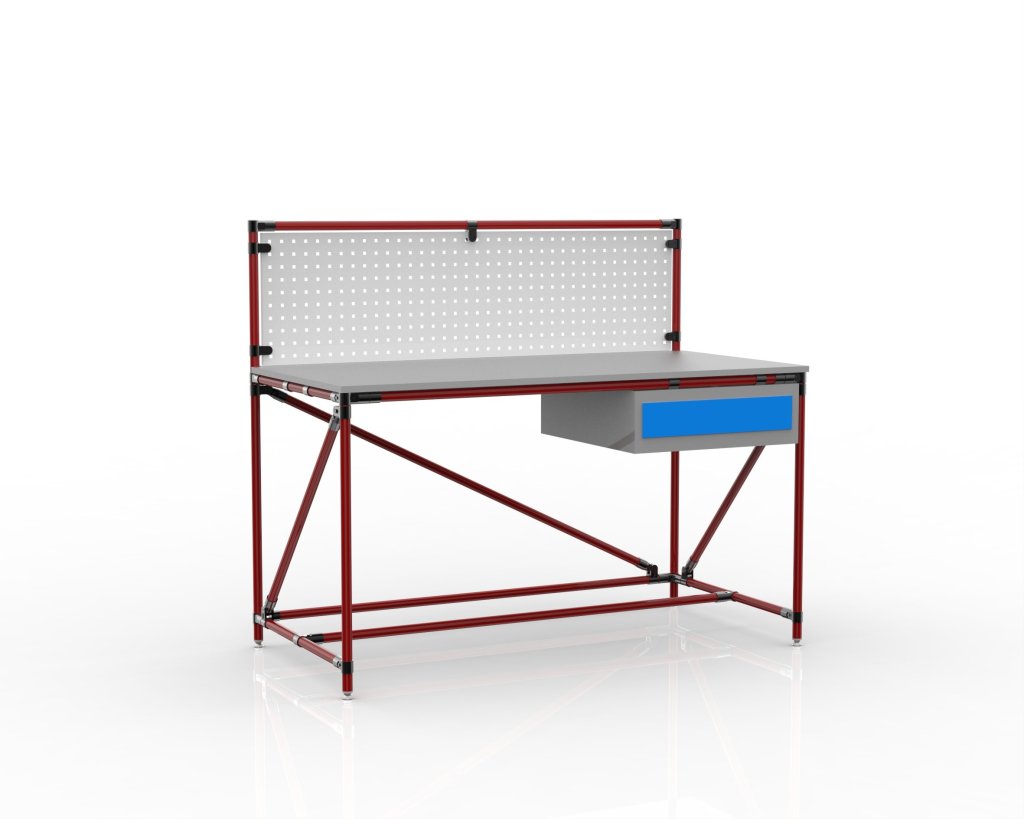Stół warsztatowy z tablicą perforowaną z systemu modułowego rurowego. Stół składa się z blatu z płyty wiórowej obustronnie laminowanej o grubości 18 mm, kontenerka stołowego z jedną szufladą, tablicy perforowanej do zawieszania narzędzi lub skrzynek oraz czterech regulowanych nóżek. Nośność przy równomiernym obciążeniu 100 kg. Wymiary 1282 x 1500 x 750 mm.