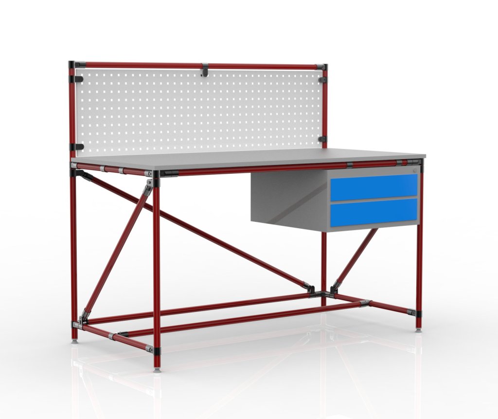 Stół warsztatowy z tablicą perforowaną z systemu modułowego rurowego. Stół składa się z blatu z płyty wiórowej obustronnie laminowanej o grubości 18 mm, kontenerka stołowego z dwiema szufladami, tablicy perforowanej do wieszania narzędzi lub pudełek oraz czterech regulowanych nóżek. Nośność przy równomiernym obciążeniu 100 kg. Wymiary 1282 x 1500 x 750 mm.