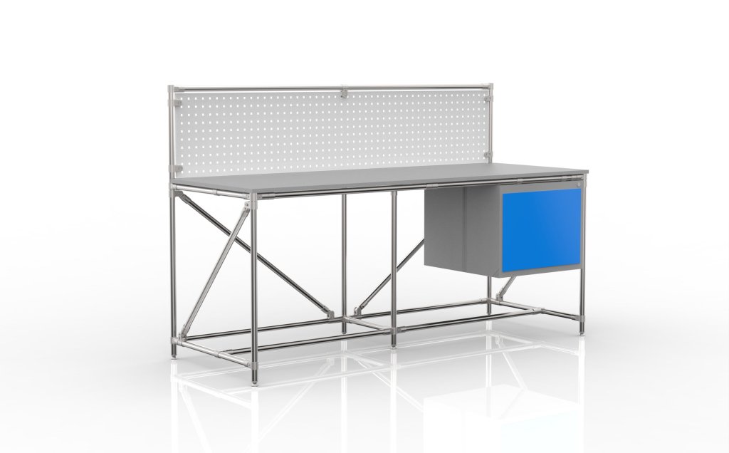 Stół warsztatowy z rurowego systemu modułowego. Stół składa się z blatu z płyty wiórowej obustronnie laminowanej o grubości 18 mm, kontenerka na stół, tablicy perforowanej do zawieszania narzędzi lub skrzynek oraz czterech regulowanych nóg. Nośność przy równomiernym obciążeniu 100 kg. Wymiary 1282 x 2000 x 750 mm.