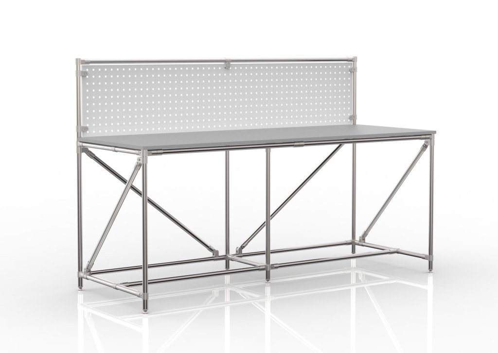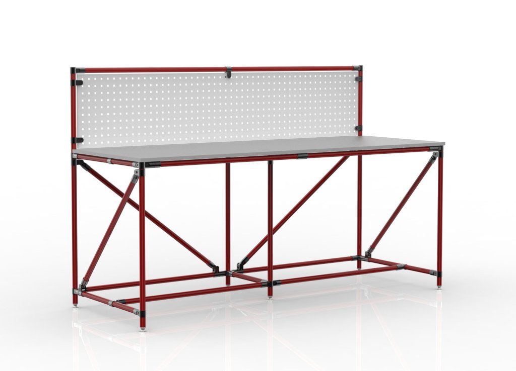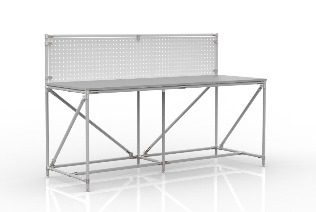 Stół warsztatowy z rurowego systemu modułowego. Stół składa się z blatu z płyty wiórowej obustronnie laminowanej o grubości 18 mm, kontenerka na stół, tablicy perforowanej do zawieszania narzędzi lub skrzynek oraz czterech regulowanych nóg. Nośność przy równomiernym obciążeniu 100 kg. Wymiary 1282 x 2000 x 750 mm.
