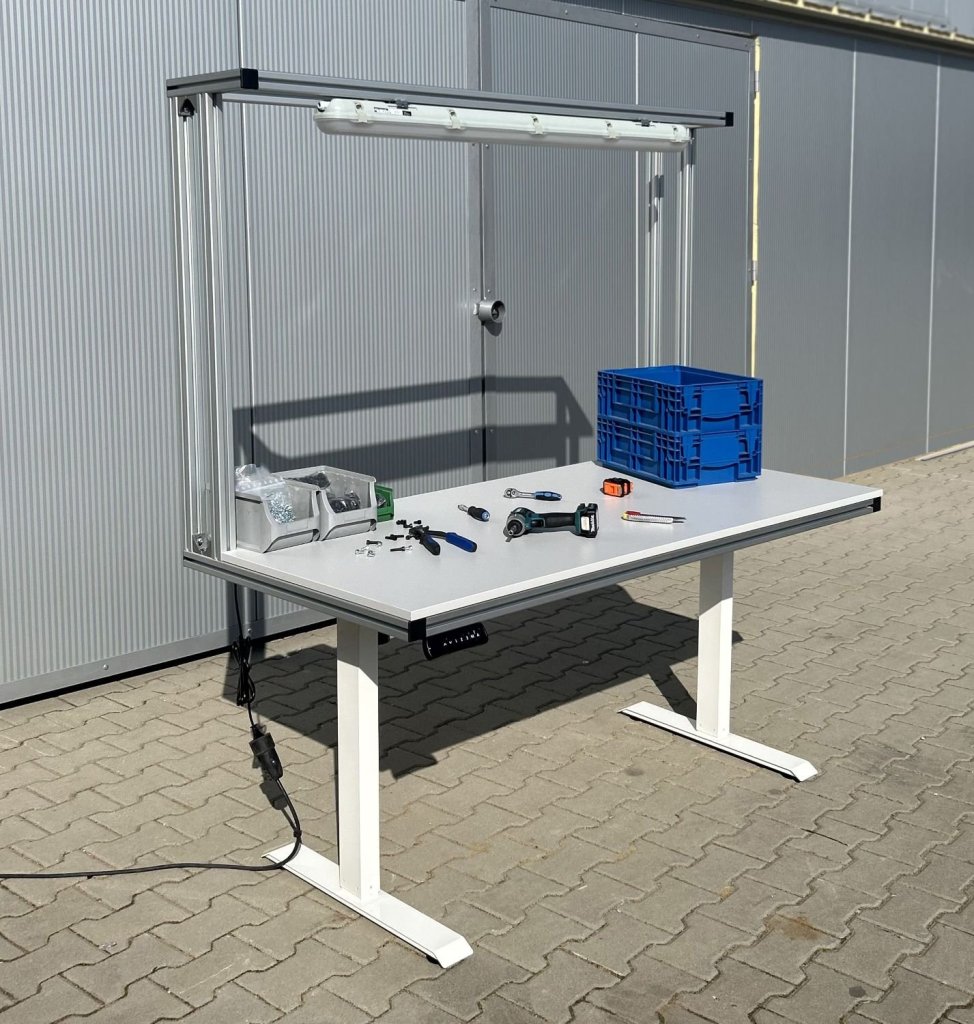 Elektrycznie regulowany stół z profili aluminiowych, łączący wysoką stabilność i wytrzymałość, odpowiedni do stanowisk pracy wymagających szybkiej i wygodnej zmiany wysokości.
