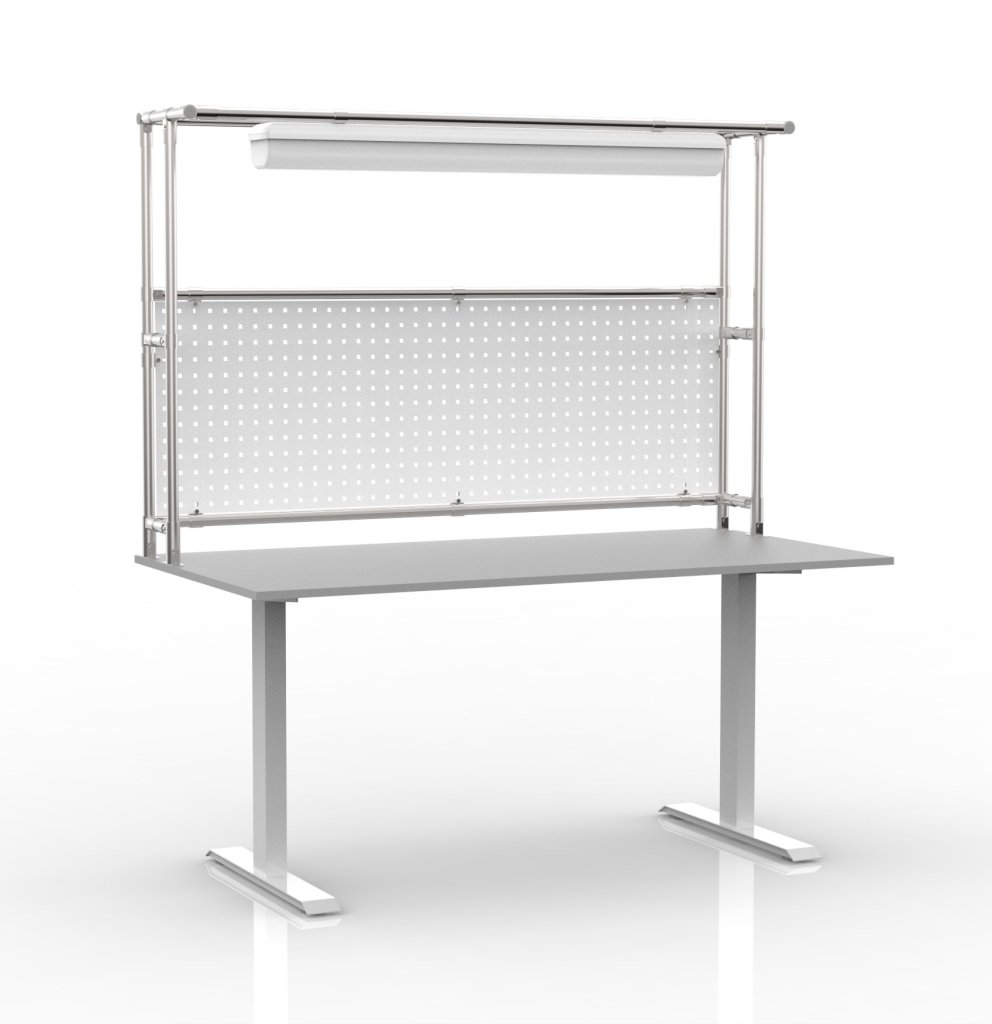 Stół warsztatowy z regulacją wysokości z nadbudową wykonaną z systemu modułowego rurowego i panelu perforowanego. Zakres regulacji wysokości 726 - 1226 mm. Podstawą stołu jest podstawa z elektrycznie regulowaną wysokością, stanowiąca idealne połączenie stabilności i trwałości. Stół uzupełnia płyta laminowana o grubości 18 mm, oświetlenie LED. Nośność 70 kg. Wymiary stołu 1765 x 1600 x 800 mm.