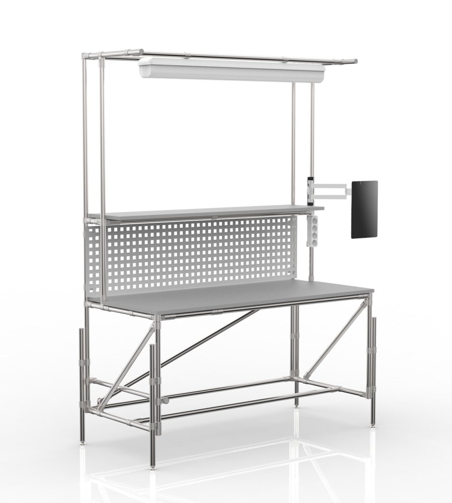 Stół antystatyczny z regulacją wysokości z rurowego systemu modułowego. Stół ten wyposażony jest w płytę laminowaną ESD o grubości 19 mm, która zapewnia niezawodną ochronę przed wyładowaniami elektrostatycznymi. W skład stołu wchodzi również panel perforowany ESD, który umożliwia łatwe i sprawne rozmieszczenie narzędzi i materiałów przy jednoczesnym zachowaniu właściwości antystatycznych stołu. Nośność 150 kg. Wymiary 1950 - 2250 x 1500 x 700 mm.
