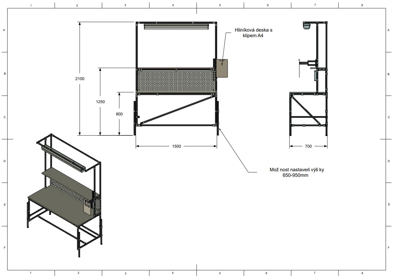 Stół antystatyczny z regulacją wysokości z rurowego systemu modułowego. Stół wyposażony jest w płytę laminowaną ESD o grubości 19 mm, która zapewnia niezawodną ochronę przed ładunkami elektrostatycznymi. W zestawie znajduje się również pojemnik ESD, panel dziurkacza ESD, oświetlenie i aluminiowa płytka z klipsem A4, która pozwala mieć ważne dokumenty pod ręką. Nośność przy równomiernym obciążeniu 150 kg. Stół posiada regulowaną wysokość w zakresie 650 – 950 mm. Wymiary 2100 x 1500 x 700 mm.