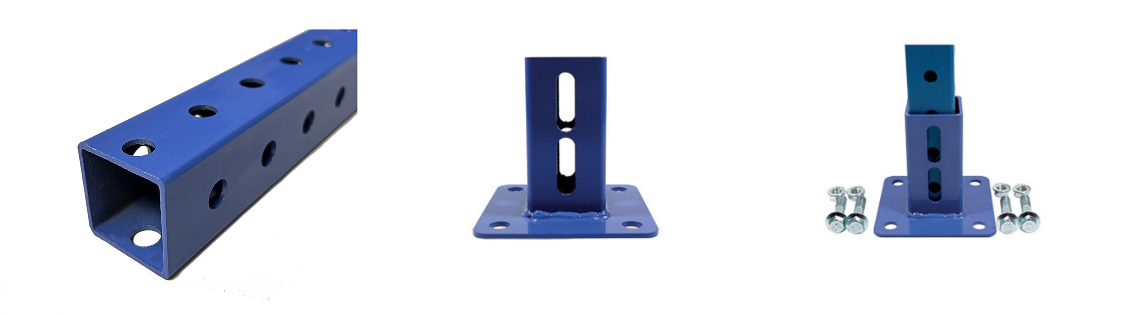 Podstawą całego systemu są perforowane rury kwadratowe o wymiarze 40 x 40 mm i grubości materiału 2 mm. Regularna perforacja to nie tylko zaleta estetyczna, ale także skuteczny sposób na oszczędność czasu podczas montażu. Każda rura kwadratowa posiada precyzyjny układ otworów, co upraszcza i przyspiesza proces montażu bez konieczności zajmowania się przez pracownika dodatkową modyfikacją materiału. W systemie zastosowano śruby gwintowane M10 do akcesoriów i M8 do kół. Ponadto cały system można zmontować za pomocą zaledwie 2 kluczy bez konieczności spawania.
