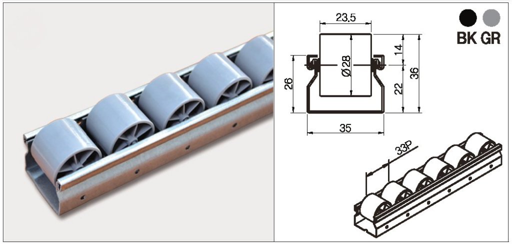 Szyna do systemu rolkowego, szerokość 35 mm, długość całkowita 4000 mm. Korpus stalowy, średnica rolek 28 mm. Kolor rolki szary (GR) lub czarny (BK).