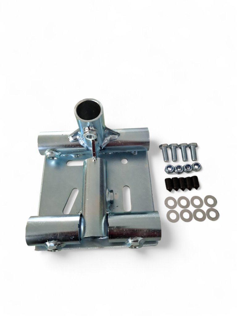 Narożny uchwyt rurowy łączący z otworami do mocowania kół z płytką. Kolor srebrny. pełny opis i parametry