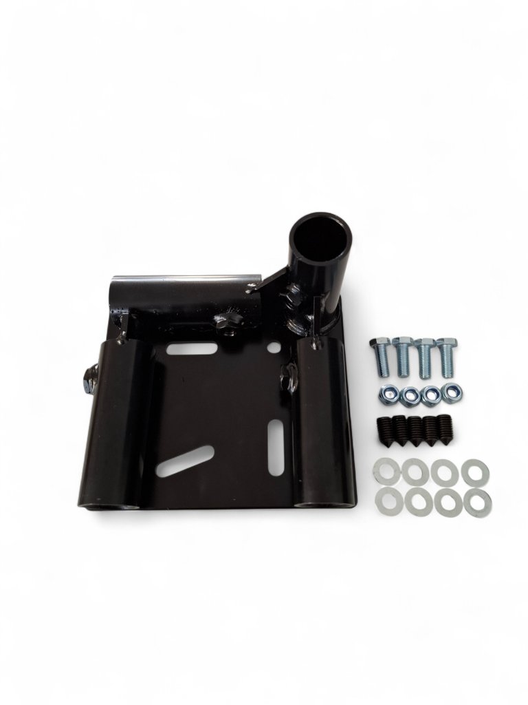 Rogowy uchwyt łączący rury z otworami do mocowania kółek z płytą. Kolor czarny.