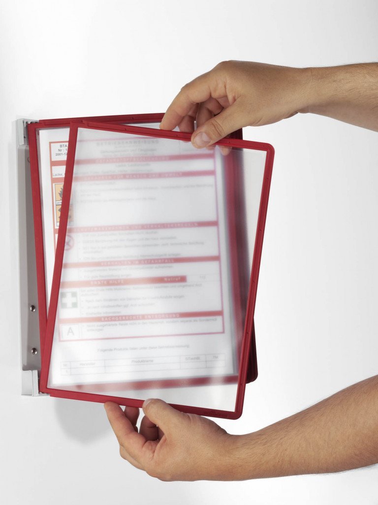 Magnetyczny uchwyt ścienny z 5 panelami prezentacyjnymi SHERPA® w formacie A4 w różnych kolorach. Łatwa obsługa i instalacja. Dzięki powierzchni magnetycznej podstawę można przymocować do wszelkich metalowych płaszczyzn