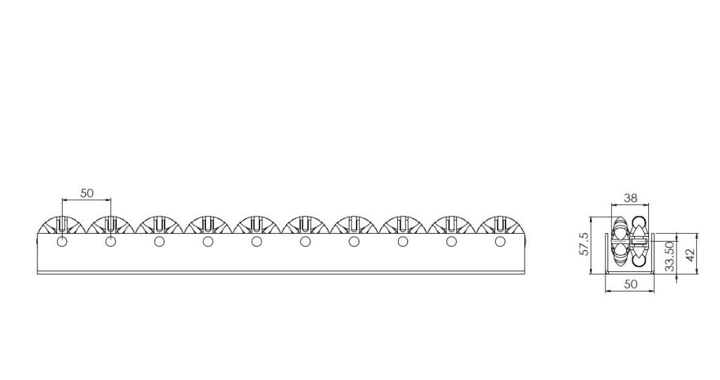 Wielokierunkowa prowadnica rolkowa o szerokości 50 mm i długości całkowitej 4000 mm. Korpus stalowy pokryty cynkiem, średnica rolek 49 mm.