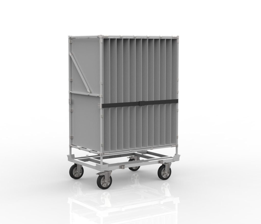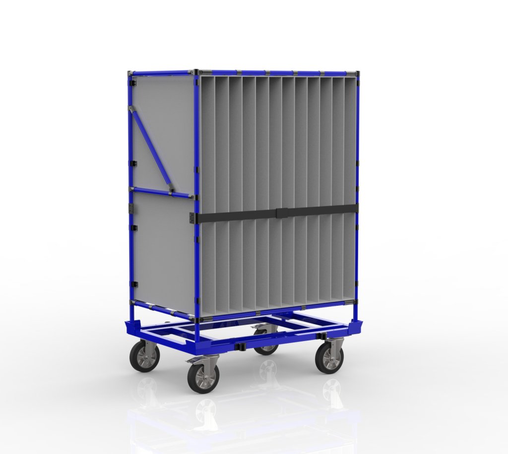 Spawany wózek z nadstawką z systemu rurowego i dwoma półkami. Podstawę wózka stanowi spawana stalowa rama z ocynkowaną powierzchnią, a nadstawka wykonana jest z systemu modułowego z rur, z laminowaną wkładką PP z wyjmowanym dnem w każdej przegrodzie. Do zabezpieczenia przechowywanych materiałów służą pasy mocujące z oczkami po obu stronach. Wózek wyposażony jest w dwa kółka skrętne z hamulcem i dwa skrętne bez hamulca o średnicy 200 mm. Nośność wózka: 240 kg. Nośność półek: 120 kg. Wymiary: 1883 x 1203 x 803 mm.