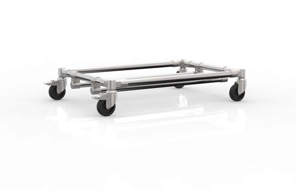 Podwozie przeładunkowe wykonane z systemu rurowego nadaje się do różnych celów przeładunkowych w magazynach i warsztatach. Podwozie zawiera 2 kółka skrętne z hamulcem i 2 kółka skrętne bez hamulca o średnicy 75 mm, które umożliwiają łatwe przemieszczanie przedmiotów. Wymiar wewnętrzny przeznaczony jest dla pudełka o wymiarach 600 x 400 mm. Wymiary 678 x 478 x 138 mm.